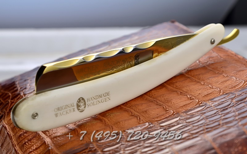 ОписаниеШирина полотна 7/8", вогнутость 1/1, традиционная немецкая углеродистая сталь. Кованная волнообразная спинка не имеющая аналогов в мире. На лезвии позолоченная надпись Wacker – Razor. Ручка из кости буйвола с гравировкой.