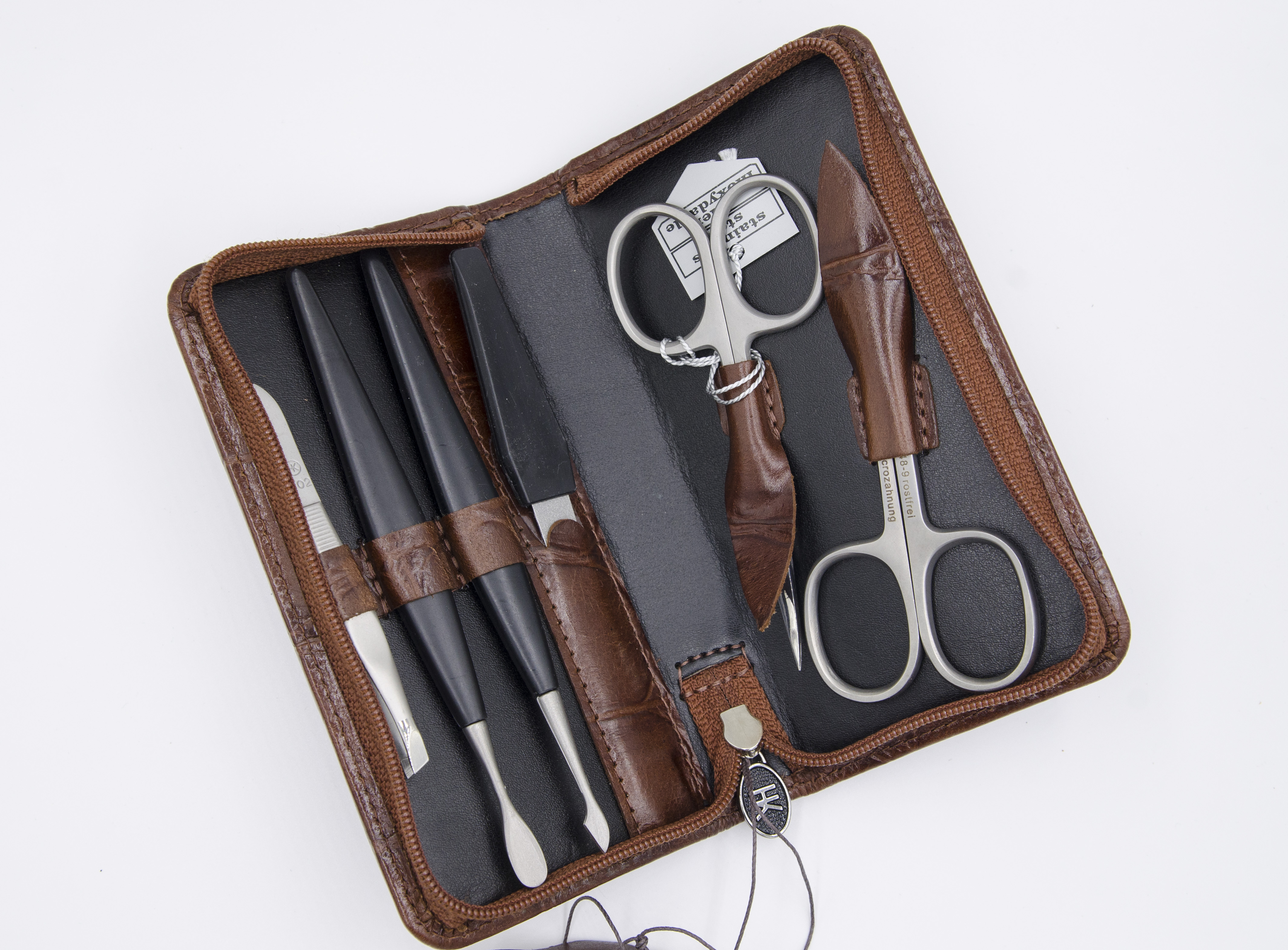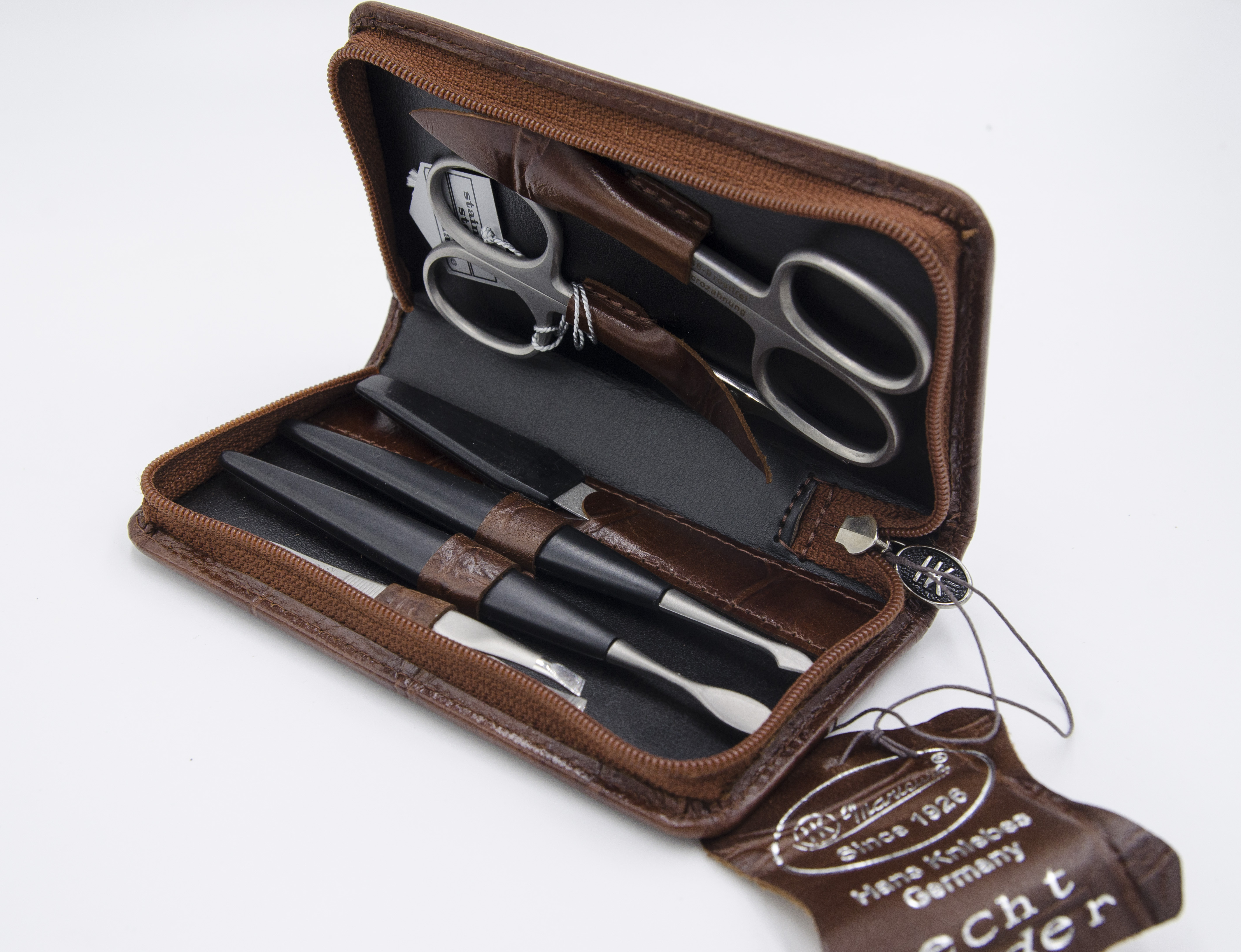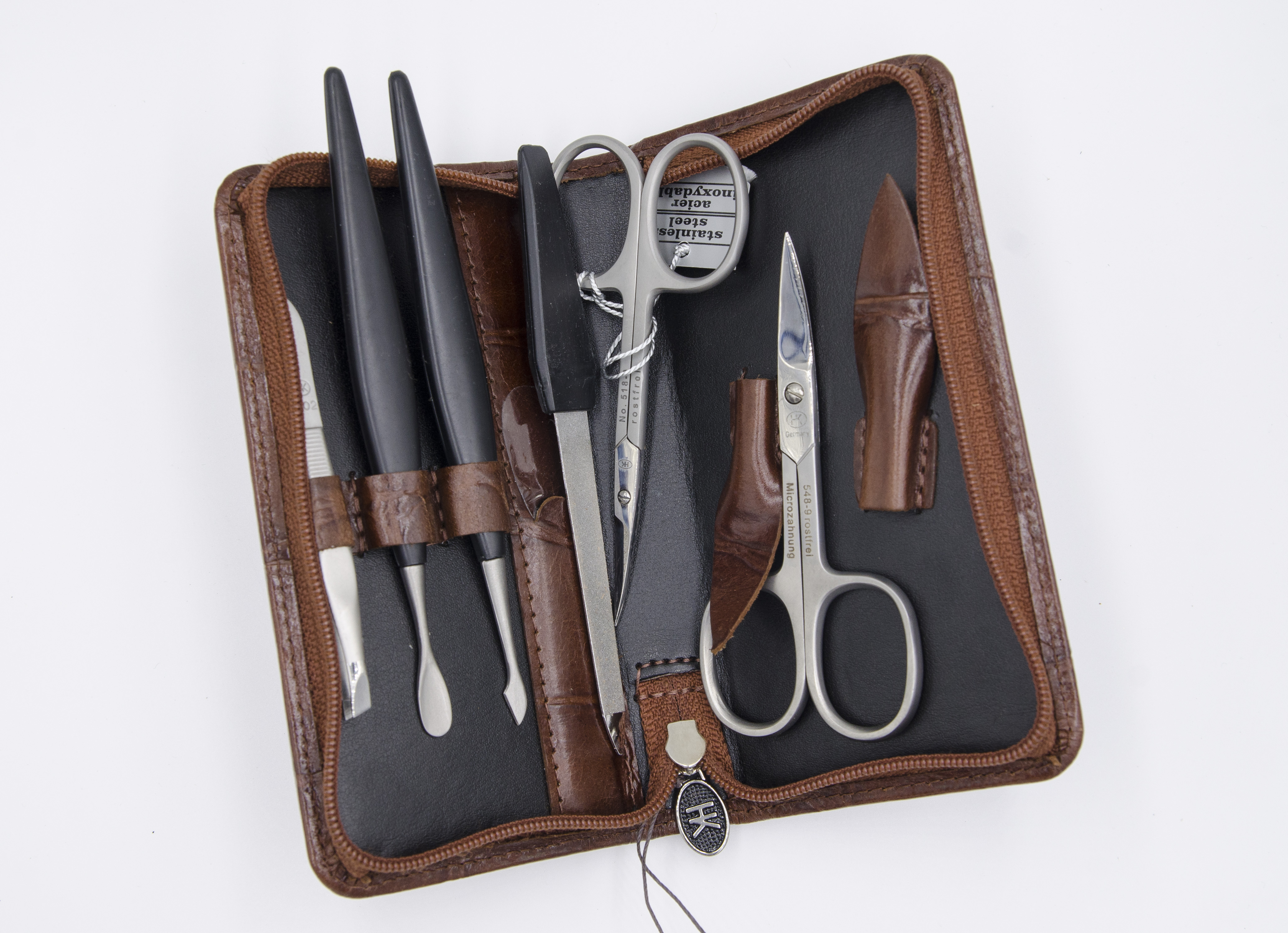 Изящный и стильный маникюрный набор в футляре от производителя Hans Kniebes превосходно сочетает в себе полный спектр высококачественных инструментов из нержавеющей хромоникелевой немецкой стали города Solingen, которые обеспечат полноценный профессиональный маникюр в домашних условиях. Набор аккуратно сложен в кожаный футляр коричневого цвета с уникальным дизайном на молнии.