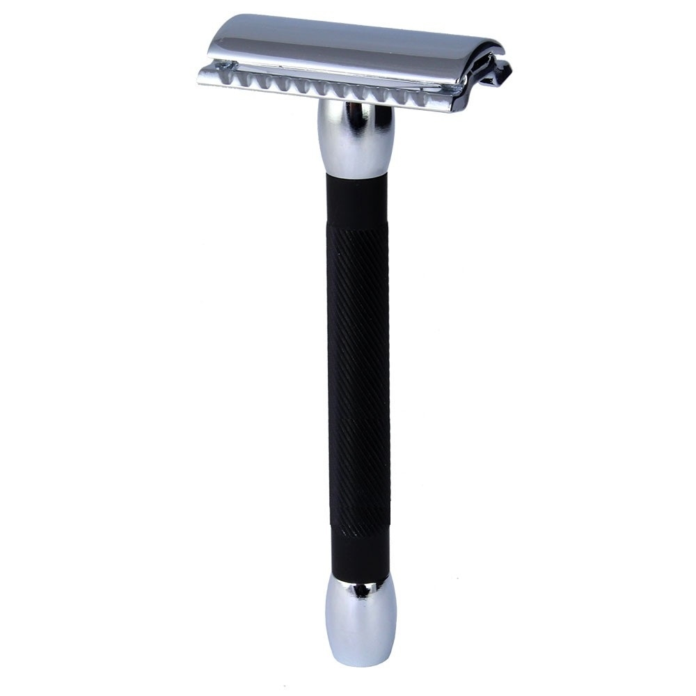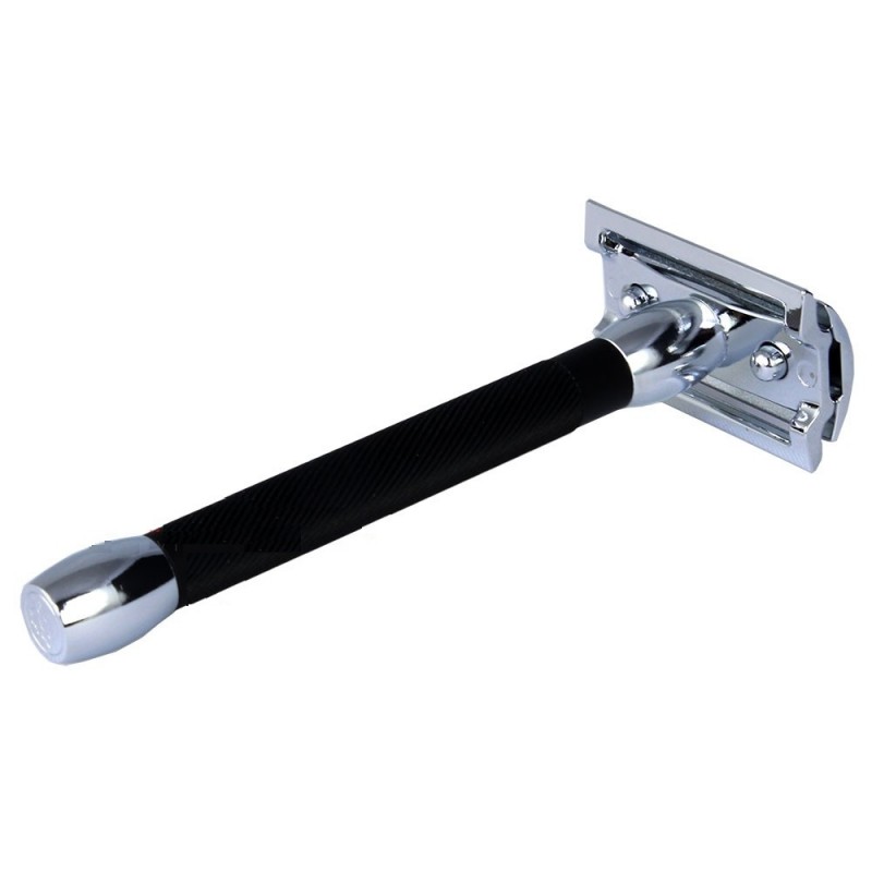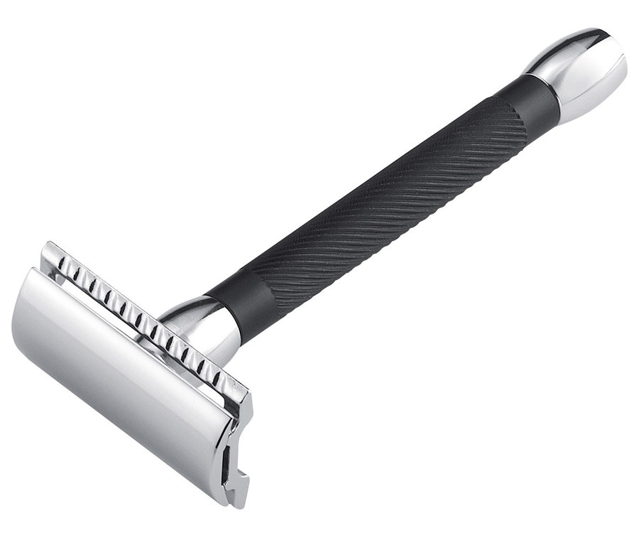 ОписаниеБезопасный станок Merkur 20 011, удлиненный, выполненный из нержавейки с хромированным покрытием и черной прорезиненной рукоятью.