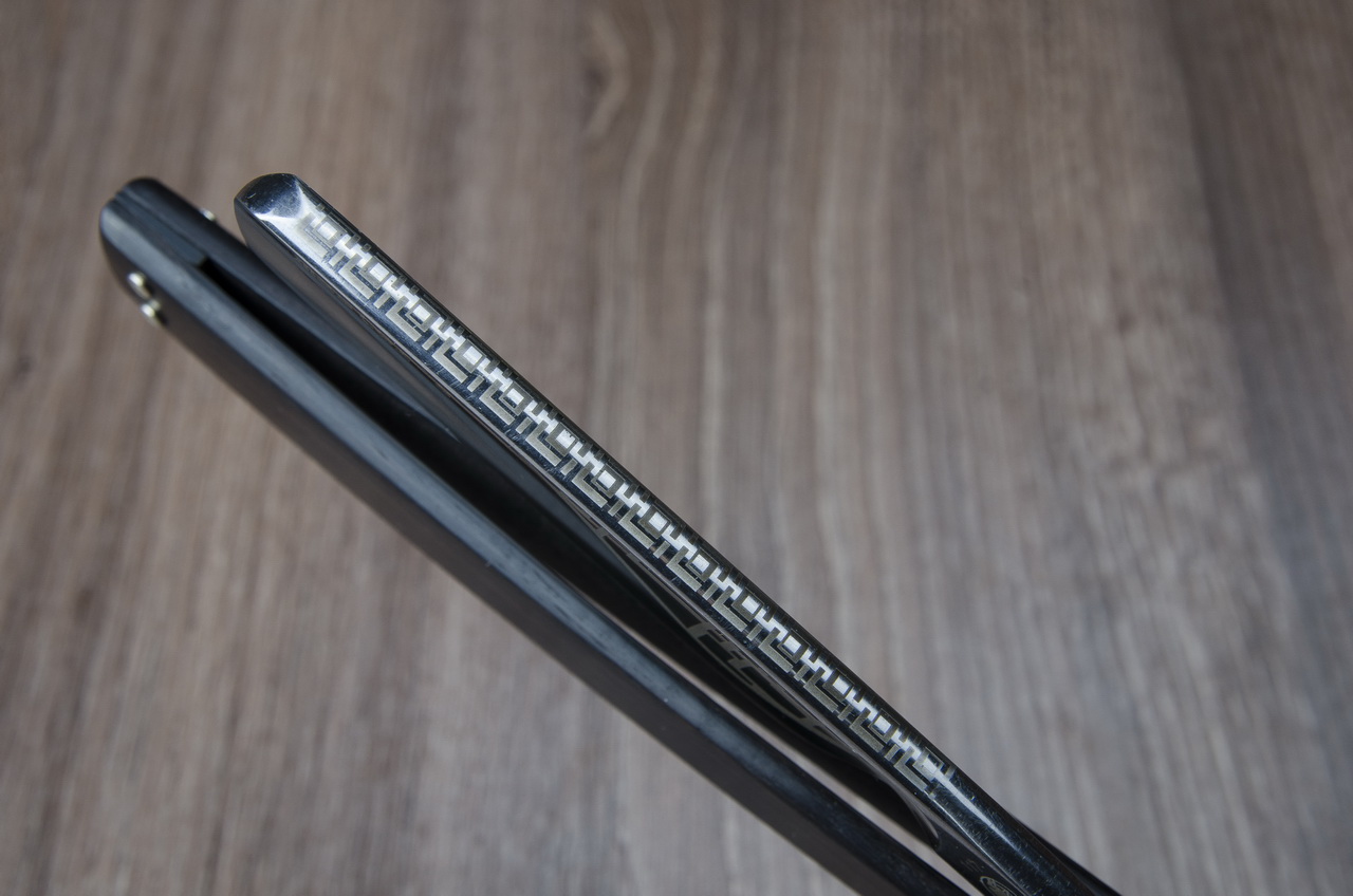 Лезвие бритвы выполнено из углеродистой стали с шириной полотна 6/8 дюйма и полной вогнутостью для гладкого и чистого бритья. Интригующий узор на полотне и спинке выполнен способом лазерной гравировки.