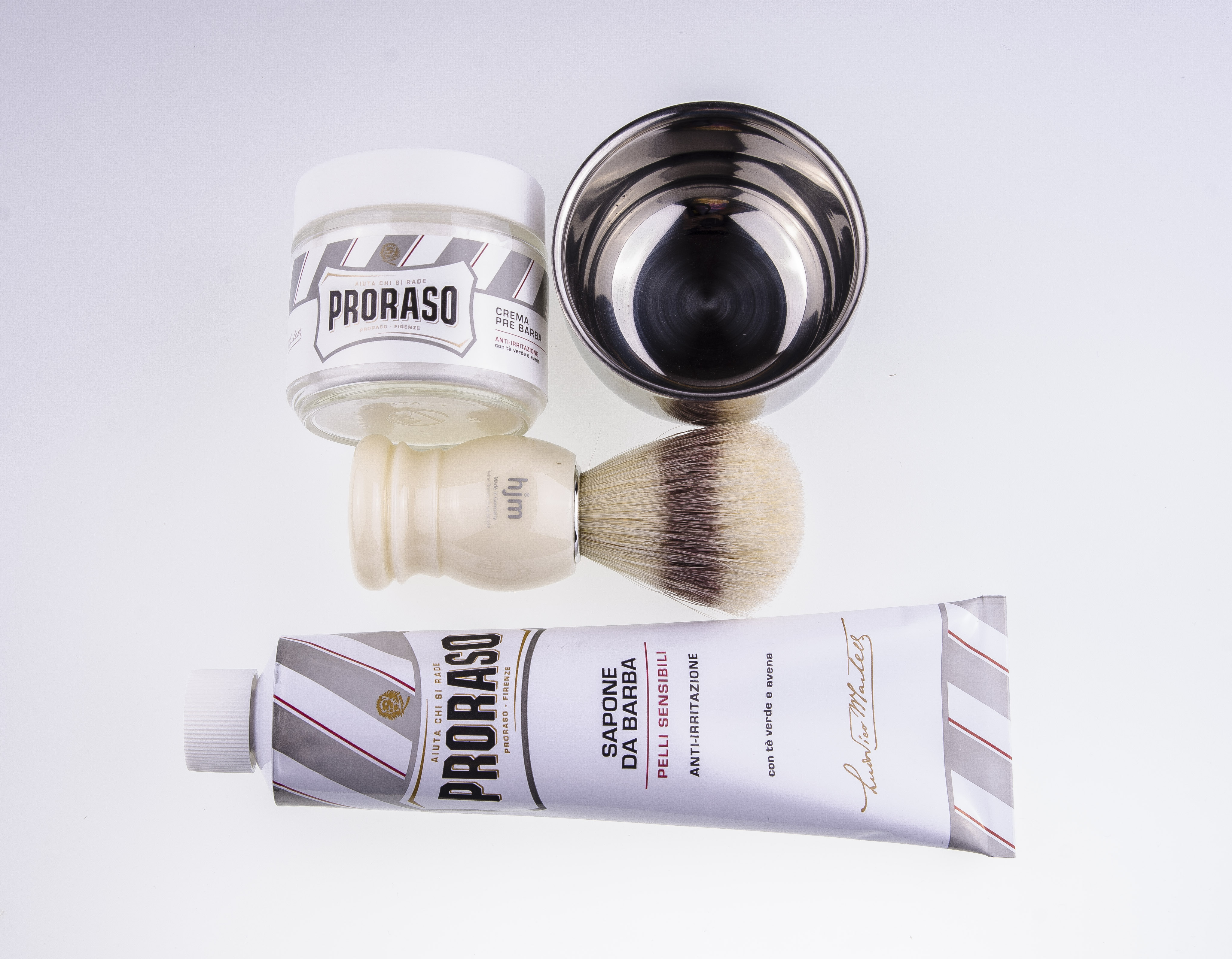 Хромированная чаша с двойными стенками, помазок, крем перед бритьем и крем для бритья от Proraso Зеленый чай и овес.