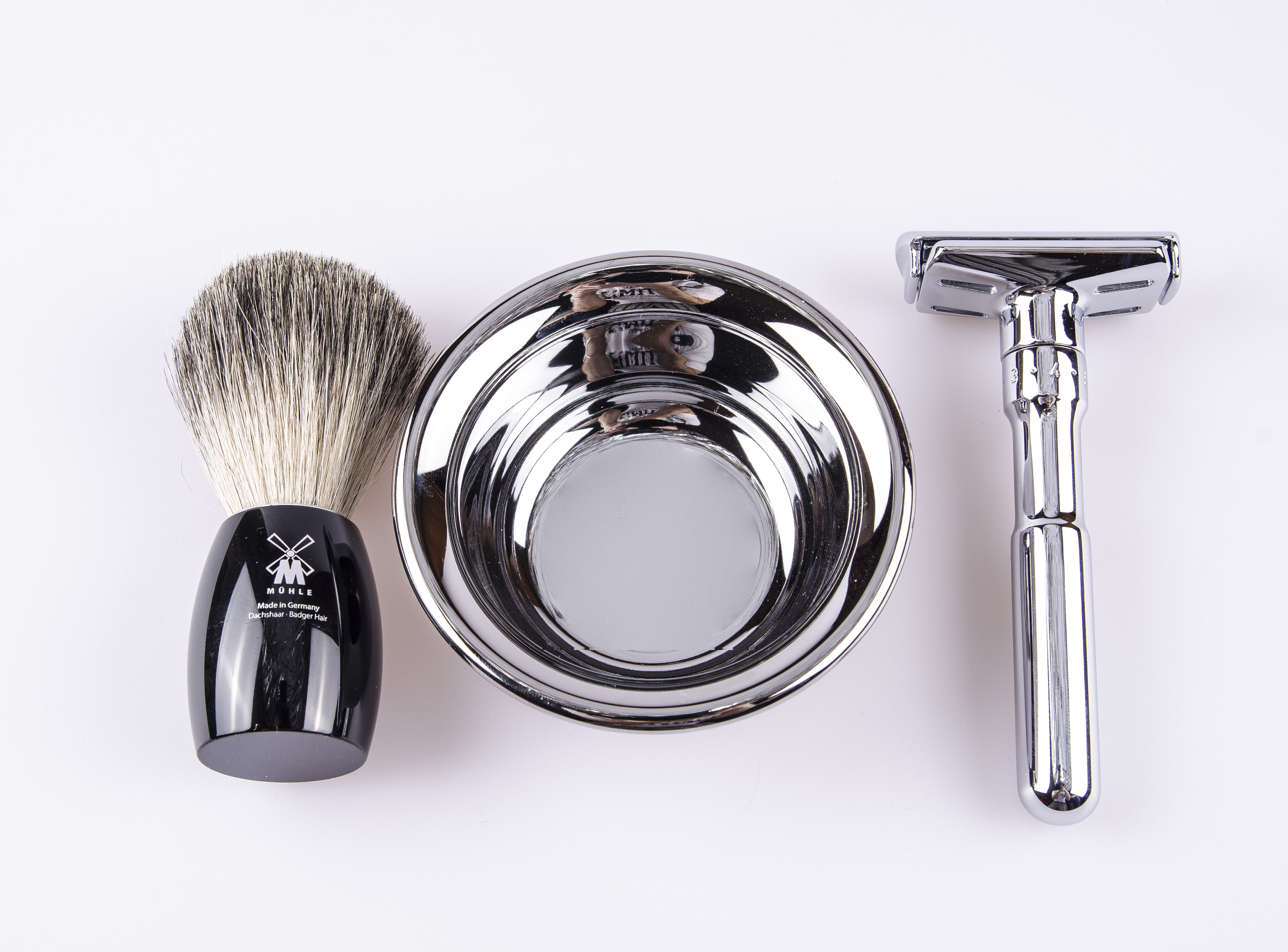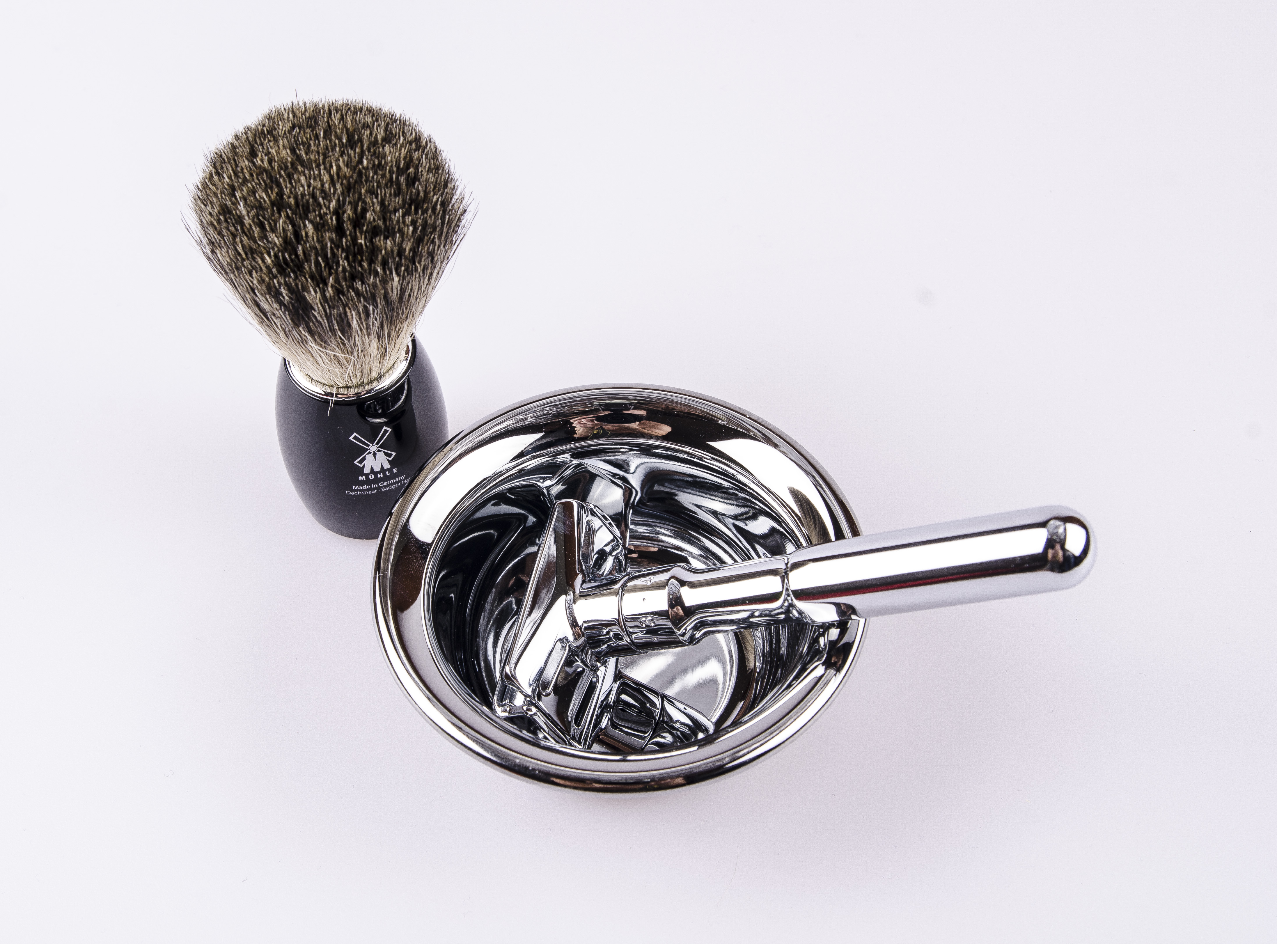 Т-образный станок Merkur Futur, чаша и помазок для бритья Muehle.