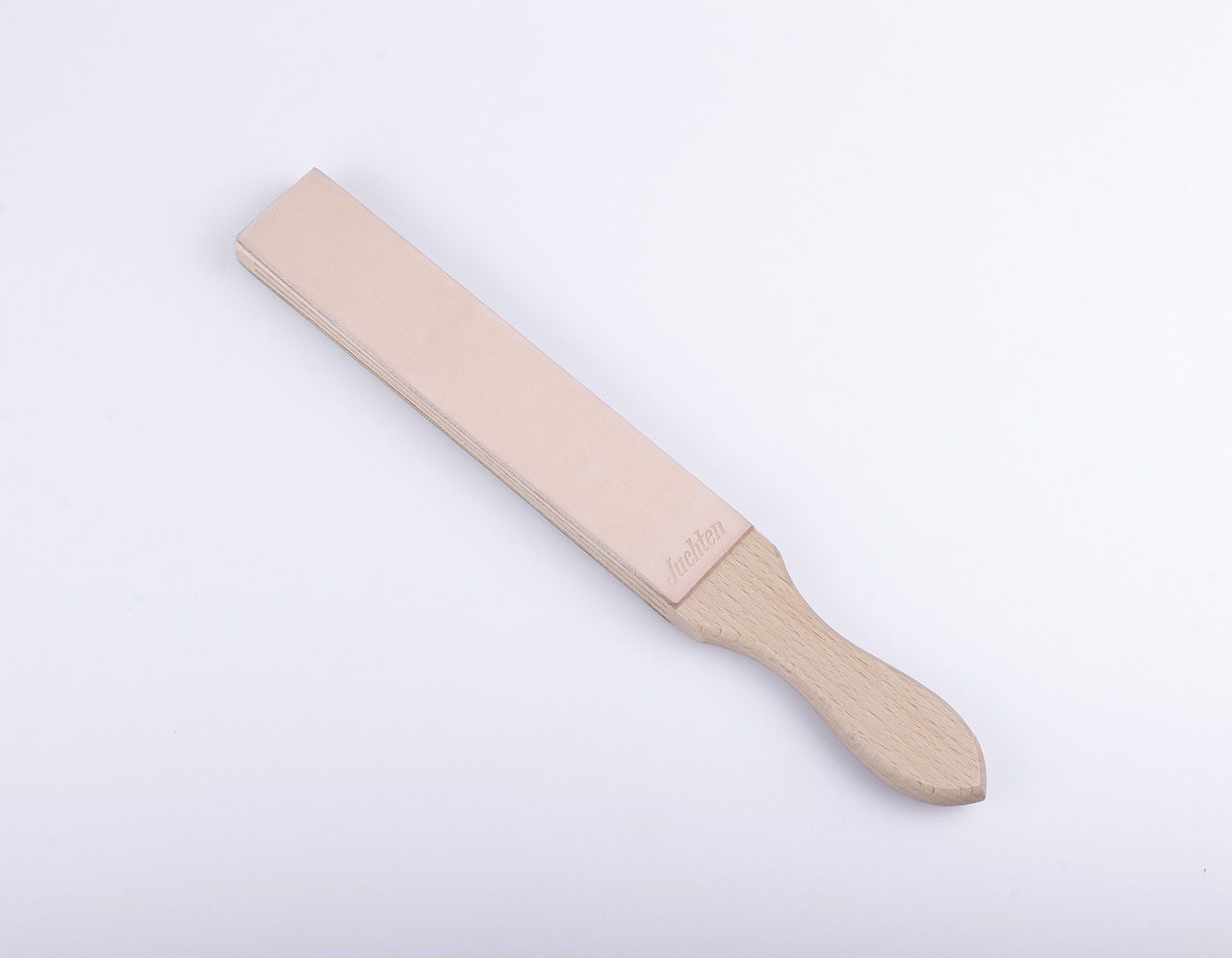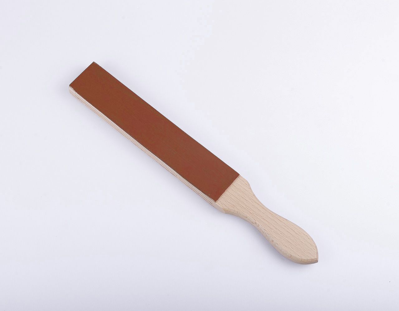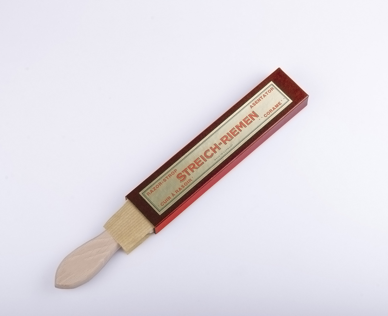 ОписаниеРемень для правки опасной бритвы двусторонний 80 Rindleder из натуральной коровьей кожи с деревянной рукоятью.