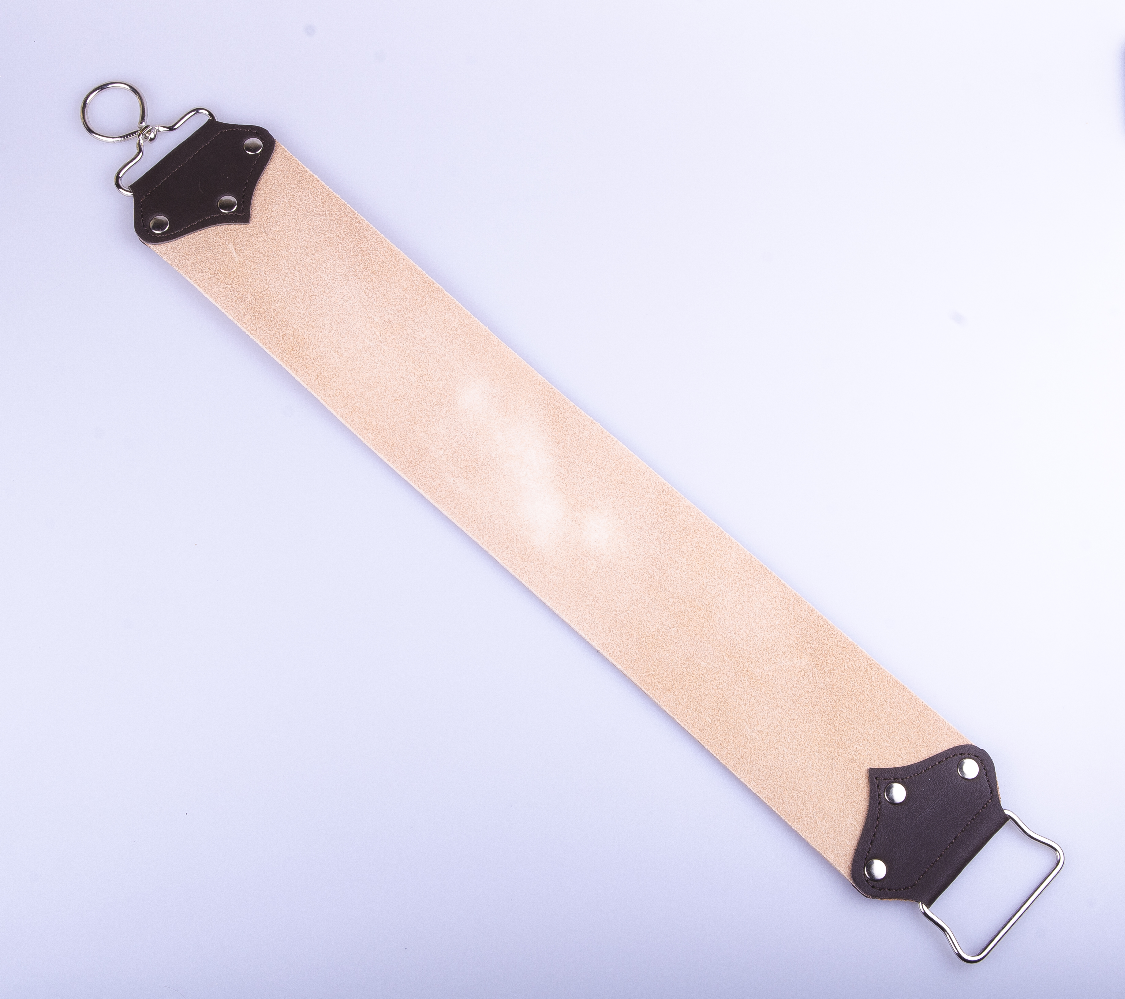 ОписаниеОдносторонний ремень для правки опасной бритвы 180 Rind изготовлен из натуральной коровьей кожи с двумя металлическими креплениями для удобного использования.
